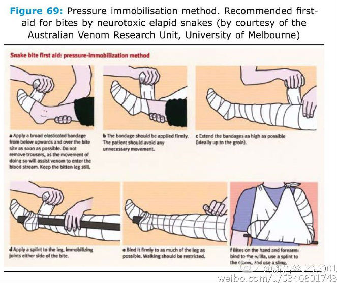 民间还有一些处理毒蛇咬伤的做法,也都是害处大于益处,例如割破、挤压伤口把蛇毒挤出来,或者用嘴把蛇毒吸出来,给伤口敷号称能抗蛇毒的草药,用冰块敷伤口,等等,这些做法,都没有效果,反而会帮助蛇毒在体内扩散,或者会造成伤口受细菌严重感染。以前医学界还建议过在伤口的上方紧紧地绑上止血绷带,不让蛇毒随着血液循环。但这样做很容易造成组织坏死,导致截肢,所以现在医学界是反对这种做法的。