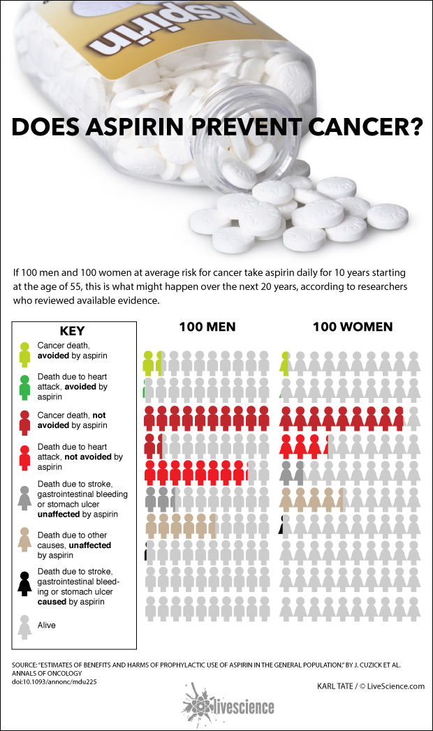 (研究者推测,假如有处在相同癌症风险下的100名男性和100名女性,从55岁开始坚持10年每天吃阿司匹林,接下来的20年里他们将可能会出现如上结果。图livescience.com)