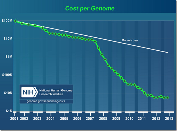 今天,基因组检测之所以成为热门话题,关键在于新一代测序仪,测序成本的剧烈下降以及测序速度的极大提升。人类的第一个基因组测序,大概花费了30亿美元,用了十年时间才完成草图。而在可预期的未来,测序费用会很快下降到1000美元,时间则缩短到24小时。这是推动基因检测进入寻常百姓家的基础,对每一个人都进行基因组测序,在技术和成本上都已经成为可能。