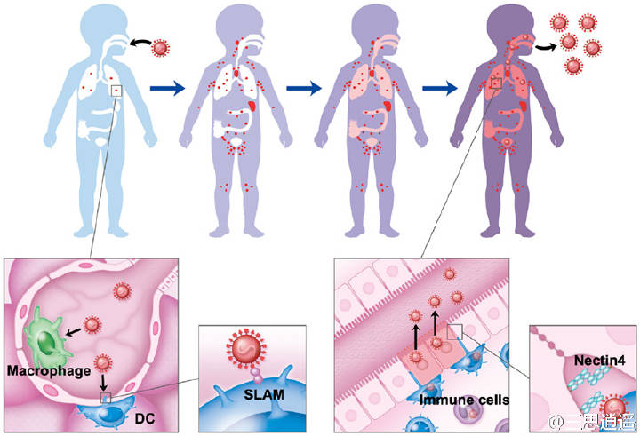 麻疹病毒是目前已知的感染性最强的病毒之一,其极限传播放大效应可高达15~20倍,这意味着,从一个患者开始,它可以在几天内席卷一个地区中的几乎所有易感受害者。但时至今日,麻疹病毒的生活史依然蒙着一层神秘的面纱,因为作为大名鼎鼎的呼吸道传播病毒,它并不是在呼吸道上皮细胞中发育成熟的。这同时也是它为何会让患者全身出疹子的原因。目前已经发现,在免疫淋巴细胞中发育成熟的麻疹病毒,可以通过一种叫Nectin4的受体蛋白引导,进入呼吸道上皮细胞,并在此进入复制循环,产生大量子代后,通过呼吸道分泌物散播出去。有趣的是,这种蛋白在肺癌、卵巢癌已经乳腺癌中的表达量很高,这意味着,也许我们能改造麻疹病毒,将之用于摧毁这些癌细胞!