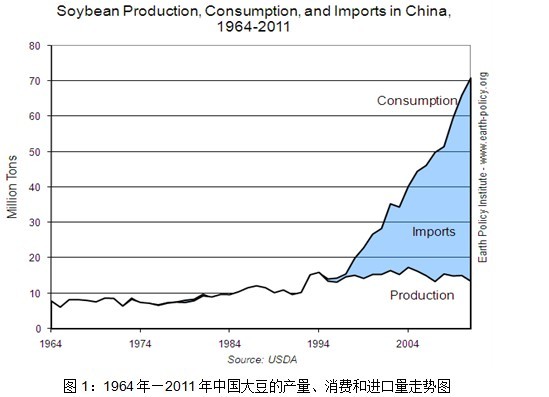 中国地大物博的自豪感伴随着人口的增长已经成为过去时,资源缺乏已经越来越明显,其中大豆的命运甚是具有代表性。实际上在上个世纪50年代以前,我国的大豆产量都是世界第一,约50年后的2011年,我国的大豆占全球的份额却跌至5.6%,同年,美国的份额是32%,巴西的份额是29%,阿根廷的份额也上升到了19%。曾经可以自给自足的大豆经济由于保守、技术落后,产量停滞不前,1960年,国产大豆的产量就达到800万吨,50年后的2011年大豆产量也才1450万吨左右。与此同时,大豆的需求伴随着经济的发展,人们生活水平的提高,早已创下了新高,我们看看从1964年—2011年中国大豆的产量、消费和进口量走势图