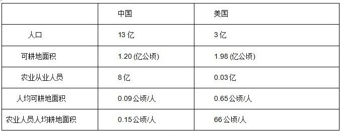我国粮油资源紧缺还与耕地面积的持续减少有关,国土部网站可以了解,全国耕地面积由1996年10月底的19.51亿亩,减少为2004年10月底的18.37亿亩, 2007年全国耕地面积为18.26亿亩,2011年,全国耕地保有量保持在18.24亿亩,有专家表示,国家“十二五”期末18.18亿亩耕地保有量目标有望落实,其实不乐观的估计,现在耕地面积是否还有18亿亩值得怀疑。全国各个地方的造城运动,毁坏的良田不计其数,以成都平原为例,以前成都市二环路以外都是良田,现在成都平原边缘才能看见成片的良田,成都周边最肥沃的耕地早已被开发区和钢筋混泥土占领、被经济价值更高的花木苗圃包围。良田零零星星成了点缀,由此一斑可见全国。而与美国相比,我国人均的可耕地面积少的可怜,如下表1。