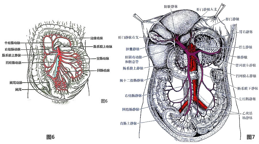 肺手太阴肺经“起于中焦,下络大肠”这一段的解剖应如图6所示,起于主动脉腹部分支中的肠系膜上动脉,自上而下,其发出的分支营养升结肠和横结肠。“还循胃口”如图7所示,属于静脉系统,自下而上,来自大小肠的静脉汇入门静脉,进入肝脏,胃右、胃左静脉是门静脉的一个小属支。消化吸收的各种成分经门静脉进入肝脏处理后再进入下腔静脉而上行,而不是由胃口直接上行。古人对于门静脉系统的解剖一无所知,因此误以为饮食物经胃的腐熟和脾的运化转化为“水谷精微”后直接上输于肺,这是完全错误的路径。