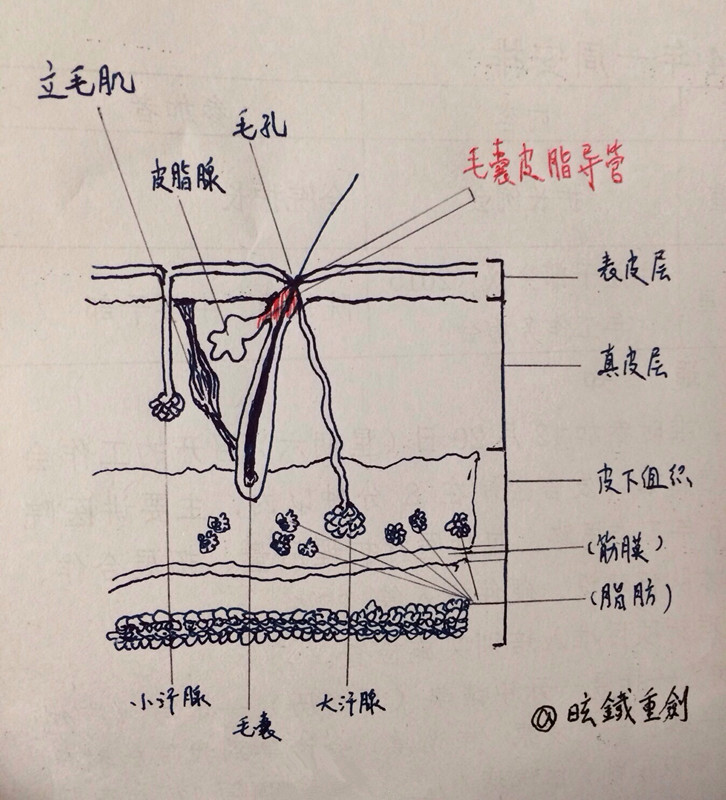 毛孔象个狭长的井口,下面除了正对着的毛囊,井口壁还有一到两个开口,分别通向皮脂腺和大汗腺。毛发与皮肤成一定的倾斜角度长出,皮脂腺通常躲在钝角那边;在腋窝、乳晕、外阴、肛周还有大汗腺,通常躲在锐角那边。每个毛孔除了是毛发生长的出口,同时也是皮脂腺分泌皮脂的出口。