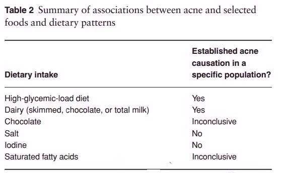 1.甜食,特别是高血糖指数食物。血糖指数(Glycemic index,简称GI)是David J. Jenkins等人于1980年-1981发展起来的。GI是衡量食物引起人体餐后血糖反应的重要指标,指的是健康人摄入含50克可吸收糖类的食物与等量的葡萄糖相比,引起餐后一定时间内血糖反应曲线下面积的百分比,GI大于70的食物为高GI食物,包括玉米片,烘烤土豆,羊角面包,白面包等。高GI饮食可以导致胰岛素敏感性下降,后者与性激素结合蛋白(SHBG)的能力变化正相关。当胰岛素功能下降导致SHBG能力也下降后,SHBG无法结合更多的游离雄激素,血液中的游离雄激素增多,转变为大量的DHT后导致皮脂腺分泌亢进,痤疮加重。