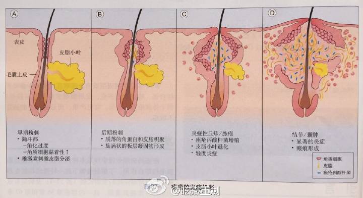 创伤达到真皮层是形成疤痕的必要条件。为什么呢?因为胶原纤维和血管都不存在于表皮,创伤如果只达到表皮是不可能留疤的,填补缺损的只可能是表皮角质形成细胞。但很遗憾,常见的皮肤创伤只要出现渗血、流血那就肯定深达真皮层或以下了;皮脂腺、汗腺和毛囊的导管虽然也要经过表皮开口于外,但它们大部分的结构还是埋在真皮层中的,所以这些皮肤附属器的损害就算没什么出血也大多容易留疤。看到这里你应该明白皮肤科医生为什么都反对患者自行“挤痘”,因为很容易挤破肿大的皮脂腺囊[1],形成真皮层的感染、炎症,为后期形成疤痕埋下伏笔。