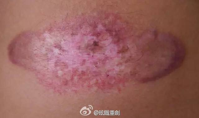 持续不退、表面增大甚至大于基底的,称为瘢痕疙瘩keloid,这个词源于希腊语chele,意即“蟹足”样,很形象地痊释了其特点–超过原发损害的范围,呈蟹足样向外伸展。瘢痕疙瘩最常见于前胸烧烫伤的人士,穿耳洞及三角肌皮肤外伤导致的也不少见,里面透明的胶原束因为聚集增厚(一般增生性疤痕没有这种改变)而变得更为肿胀、坚硬且难以消退,而那些神奇的祛疤药在它们面前也只能纷纷败下阵来。