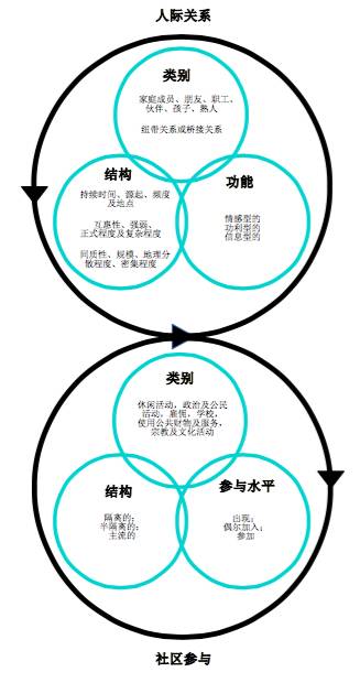 社会融合是人际关系及社区参与这两大领域相互作用的过程。其模型如图2所示,人际关系及社区参与这两大领域循环往复、互相交织并互相支持,对个体的生活质量起着核心作用。