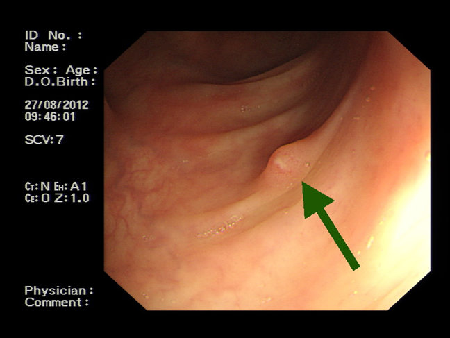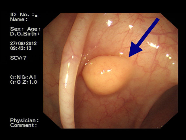 图 大肠壁上悬挂的圆形突起(箭头所指)称为大肠息肉