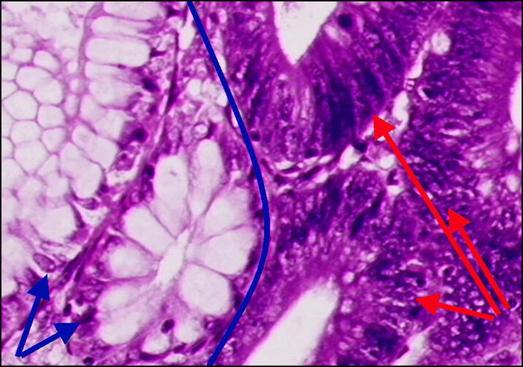 图 显微镜下看到左边(蓝箭头)是正常细胞,右边(红箭头)是癌细胞