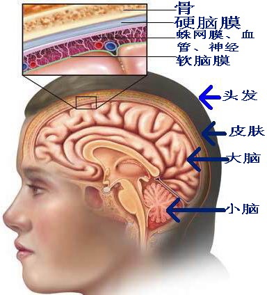 头颅,白话就是脑袋。就结构组成来看,外面的各层(头发、皮肤、颅骨、硬脑膜、蛛网膜中的血管神经、软脑膜)对于疼痛至关重要,也就是说,头痛是这些保护结构产生的,比如,脑膜本身发炎时疼痛就会出现而脑袋里面的组织(大脑、小脑)与头痛关系不大,即使大脑小脑烂了个大洞,本身是不会疼痛的。