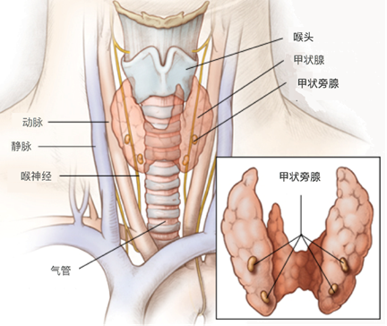 甲状旁腺是指靠近甲状腺的四个非常小的腺体,它们可以调节身体对钙的吸收、利用。控制喉头的神经也非常接近甲状腺。如果你需要进行甲状腺手术,那么你的外科医生需要识别并避免损坏这些结构。例如,如果喉头的神经遭到损坏,声音可能会变得很嘶哑,而且是永久性的。