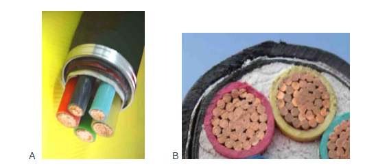 图6 A 一条粗电缆有几条细电缆组成 B 每条细电缆由许多细丝电线组成